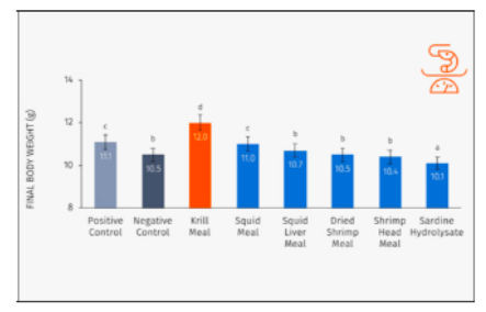 Figure 3. Final body weight of Litopenaeus vannamei juveniles fed with a soybean-based plant diet (negative control) supplemented with either 3% fish meal (positive control), krill meal or five other chemoattractants (except for sardine hydrolysate which was included at 5%) over 74 days. Different letters denote statistically significant differences between experimental diets (P<0.05). Source: Nunes et al. (2019).