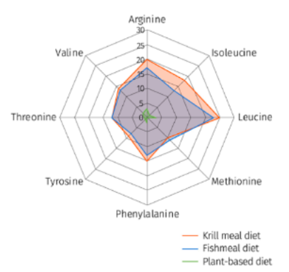 Figure 1. Essential amino acid profile (as g/100g-diet) of plant- based diets that do not contain fish meal or other animal-based protein sources (green line) with 3% fish meal (blue line), or with no fish meal and krill meal supplementation (orange line; krill meal inclusion at 110g/kg). Krill meal supplementation in no fish meal diets results in an equally high feed nutritional profile. Source: Moreno-Arias et al. (2018) for plant-based diet profile, and Nunes et al. (2011) for the fish meal and krill meal diet profiles.