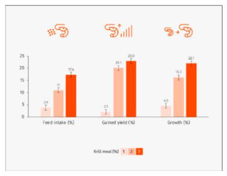 Figure 4. Effect of krill meal inclusion (1, 2 or 3%) on Litopenaeus vannamei growth, gained yield and feed intake. Results are shown as percentage increase compared to the control plant- based diet without alternative ingredients or feed additives. Source: Sabry-Neto et al. (2017).