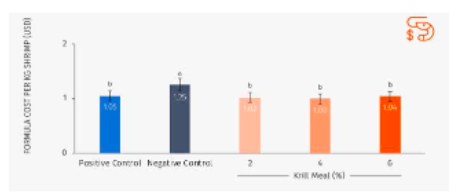 Figure 6. Impact of Krill meal inclusion in feed cost in India, one of the world’s key shrimp production areas (dietary treatment with 12 % fish meal and different Krill meal inclusion rates). Different letters denote statistically significant difference between experimental diets (P<0.05). Source: Aker Biomarine Antarctic AS.