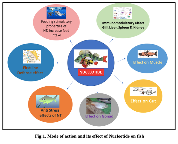 Nucleotides have various physiological and biological functions, mediate metabolism and cell signaling pathways as non-essential nutrients. When administered through exogenous diet, they act as essential nutrients to conquer stress condition, growth enhancement and gives more benefits to the fish health. In the past 40 years, efforts were made on the evaluation of dietary supplementation of nucleotides and administration on 28 fish species, including finfish and shellfish worldwide (Hossain et al., 2019).