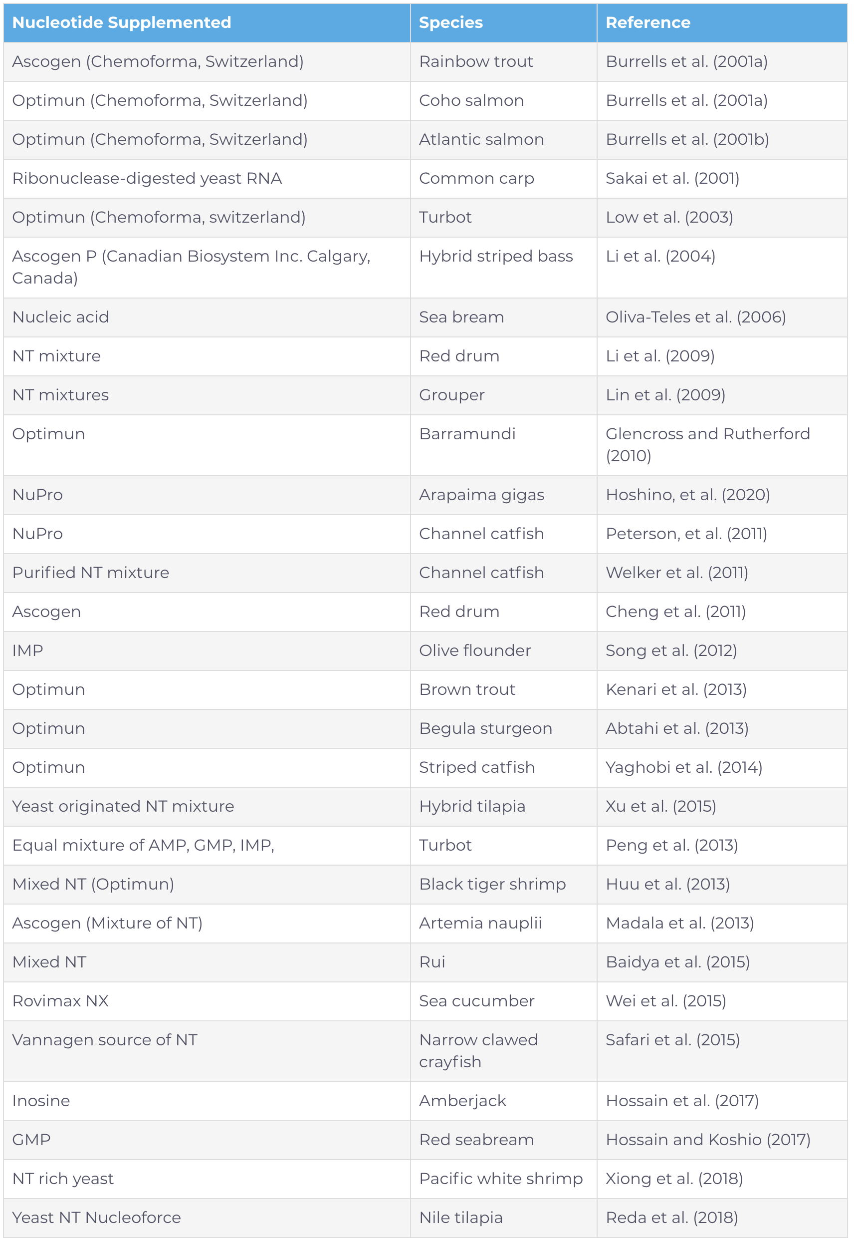 Hossain M. S., Koshio S., Kestemont P. (2019) Recent advances of nucleotide nutrition in aquaculture: a review. Reviews in Aquaculture, 1–26.