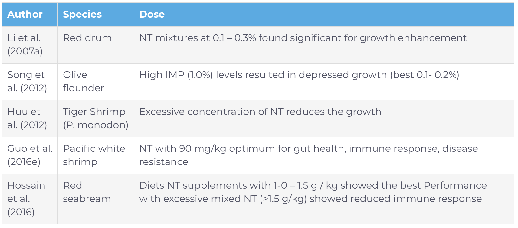 Till now, studies on dose-inclusion and its effect on dietary nucleotides are very few; Hence, there is a need to emphasize the administration of NT in various diets according to the species to understand the mechanism of the nucleotides (Xiong et al., 2018). The table mentioned below consists of various exogenous NT doses and their influence on various activities in different fishes.