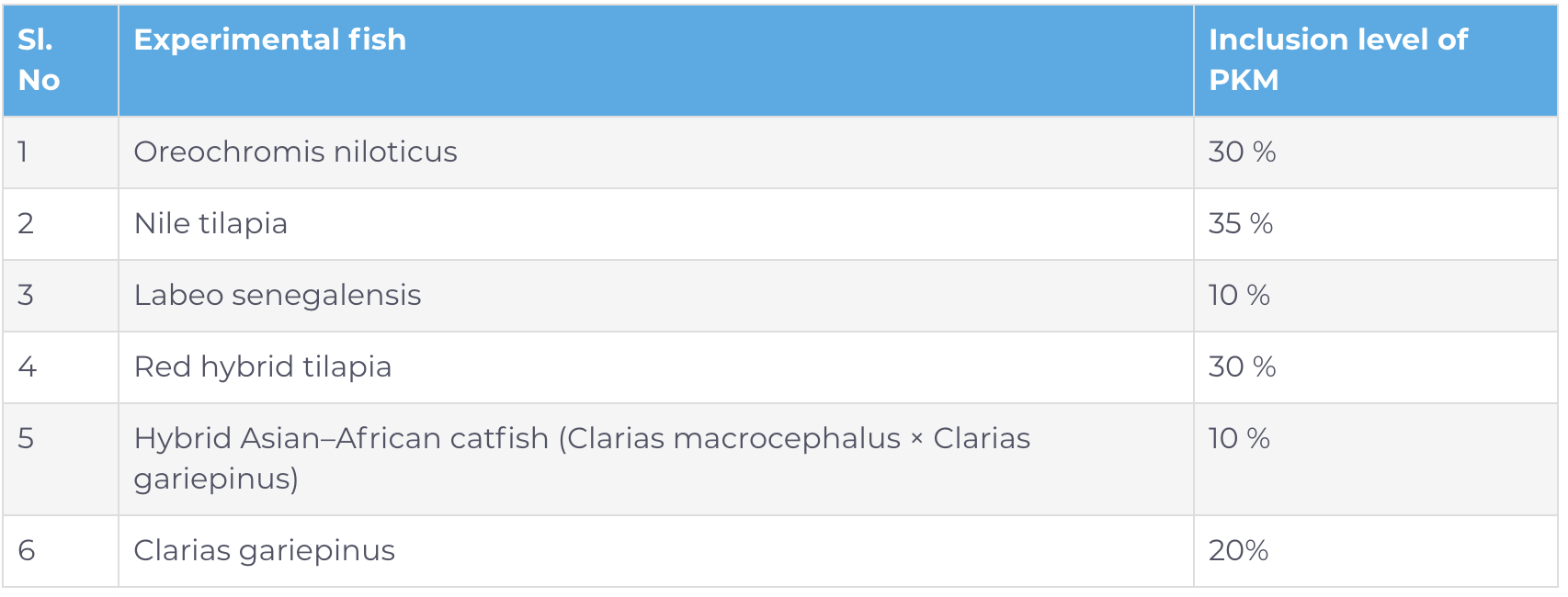 The use of PKM as a locally available non-conventional feed ingredient in the fish diets emerged in early 90’s. PKM had been substituted in the diet of tilapia and catfish fingerlings wherein, positive growth performancewas recorded at lowerinclusions levels.The following examples illustrate theinclusion levels of PKM in the diets for the effective performance of fingerlingsof different fish species (Table. 2).