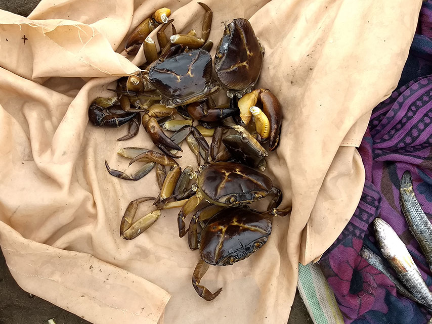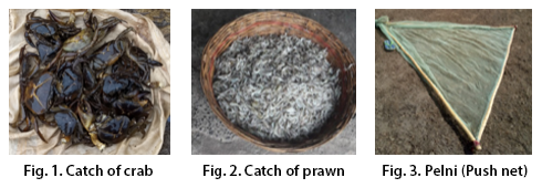 Crab is caught mainly by baited line and hand picking. In addition, accidental entangling of crabs in monofilament gill nets of varying mesh sizes in fragmented pool systems situated downstream of check dams, anicuts and reservoir connected with a web of narrow trenches over bed rock also contributed to the daily crab catches around these sites. The popular bait used in fishing crabs are small prawns and small indigenous fishes like Salmostoma spp., and Puntius spp., etc. The daily catch per day per crab fisher in post monsoon ranges from 1 to 4 kg (December- January) which gradually reduces to 0.5 to 1.5 kg during the pre-monsoon (April-May). The market price of these crabs varies from Rs. 50 to Rs. 100 per pair based on the size where larger crab specimens weighing more than 250 gm fetch higher market price.