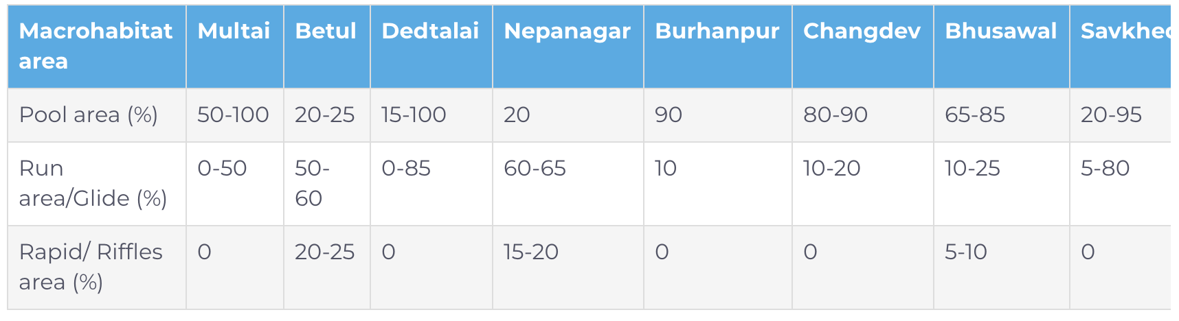 Macrohabitat refers to habitat types with presence of substantial variation in environment, varied ecological niches, and support a large and usually complex flora and fauna (Merriam-Webster dictionary, 2019). The river stretch in Madhya Pradesh and Maharashtra has been characterized by rocky substrate which transforms to different types of macrohabitats viz., pool, riffles, rapids, runs and glides owing to constant changes in instream flow, varying channel slopes, and dominant substrate present in the reach throughout its length. The details of macrohabitat distribution along upper and middle stretches of Tapti River are quantified as shown in table 1. The prawn fishing activity is limited to the marginal areas in case of pools and run. The occurrence has always been associated with the significant instream vegetation cover.
