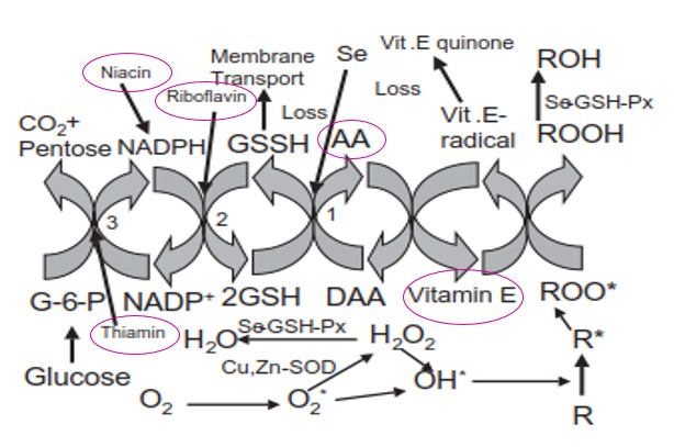 Fat soluble vitamins are absorbed mainly in intestinal tract and stored in the body’s fatty tissues and are necessary in small doses. Vitamin A (Retinol, retinal, retinyl esters) is important as a dietary supplement for all animals and plays role in two aspects, vision and gene expression regulation promoting growth and cell development. Vitamin D (Cholecalciferol or vit D3; Ergocalciferol or vit D2) is involved in regulation of growth and differentiation of various cell types and it has role in controlling plasma calcium and phosphorus. Vitamin E (tocopherols and tocotrienols), serves as an important antioxidant (Fig.2) and it is important for growth, fertility, reproduction and immune system. Vitamin K (Phylloquinone or vit K1; menaquinone, or vit K2; menadione or vit K3) play vital roles in blood coagulation and aids bone mineralization in fish. All 15 vitamins have been demonstrated to be metabolically essential for all fish species and must be obtained through the diet to maintain normal growth, reproduction and health of fish.