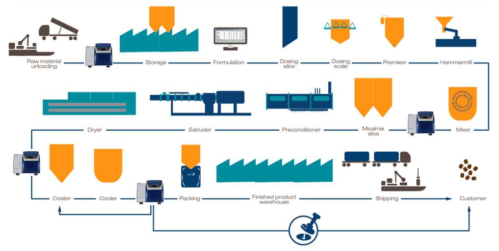 The Skretting NIR calibrations enables the formulators to ensure apt selection of raw materials according to the nutritional requirements of species thereby delivering superior quality of finished feeds match the specifications precisely (Fig. 4). This allows our esteemed customers to receive feeds with all the features and benefits the research and product development team intended. Availability of NIR in a production facility also ensures that a consistent product (feed) has been produced from batch to batch, without any major variations.