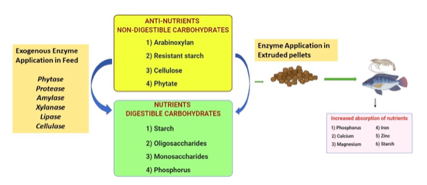 Fig. 1. A process explaining the exogenous enzyme application in extruded pellets which have the nutritional benefits to the aqua organisms.