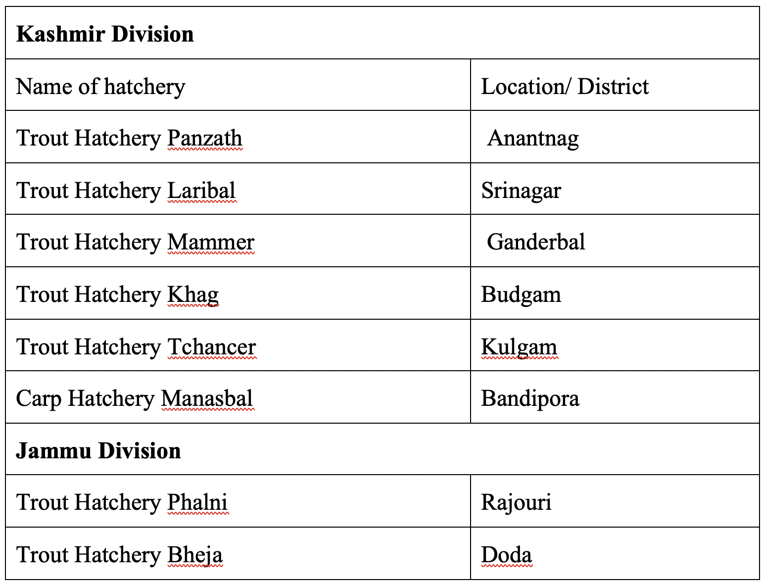 The department has established various hatcheries in different districts of the state and is enlisted below: