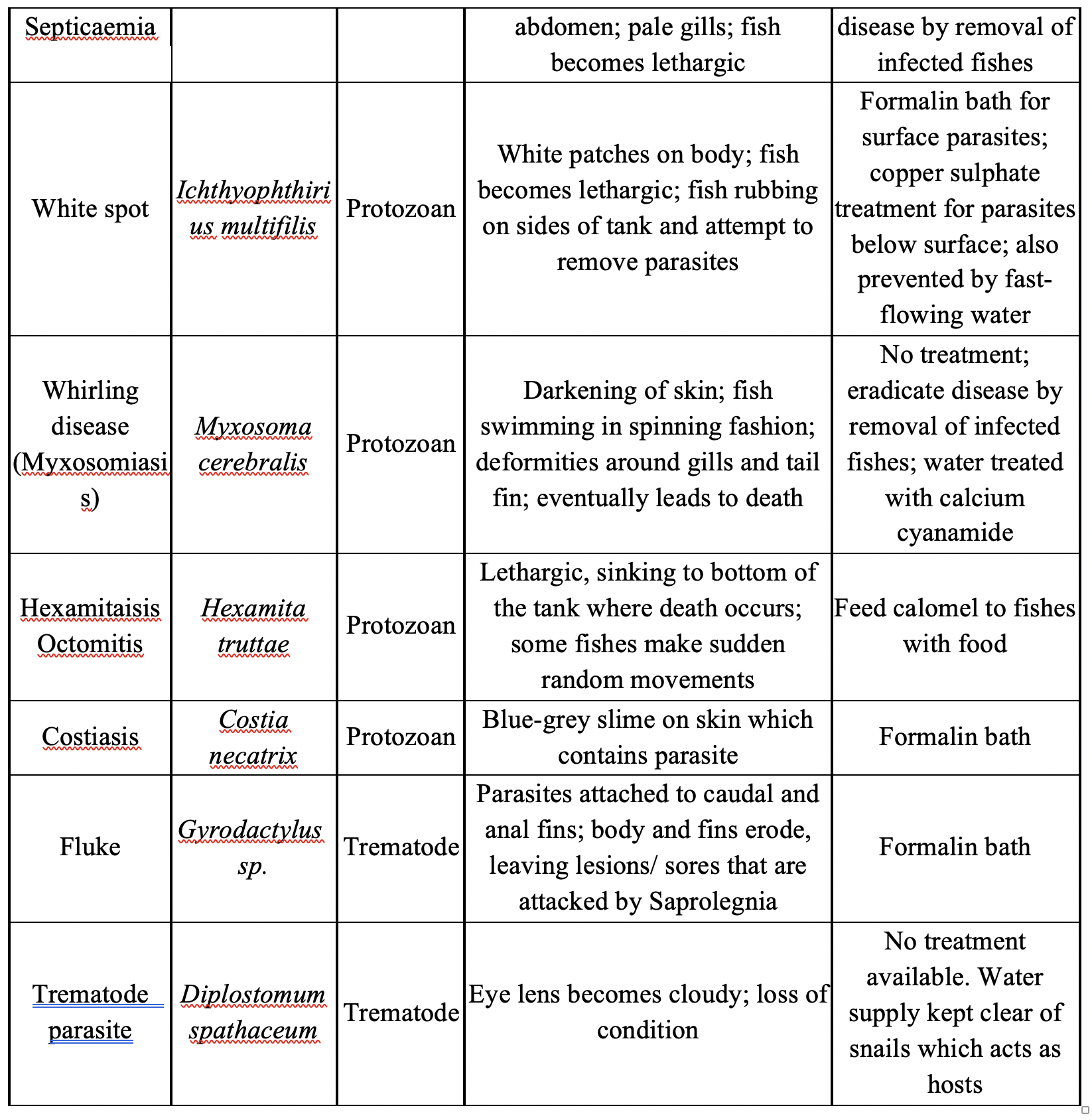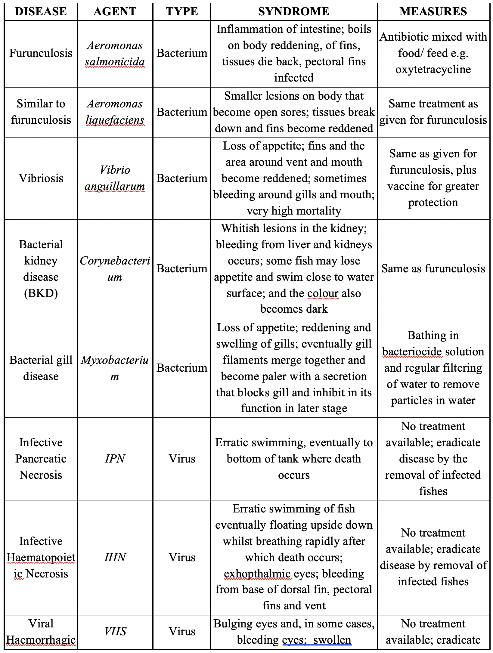 A variety of diseases and parasites affect rainbow trout in aquaculture, some are summarized in the table below. For the successful culture, prevention is the most important measure; good hatchery sanitation, good quality seed and feed disinfecting equipments etc reduces the exposure of vulnerable fish to disease-causing agents. In some cases antibiotics and other pharmaceuticals have been used in treatment but their inclusion in this table does not imply an FAO recommendation.
