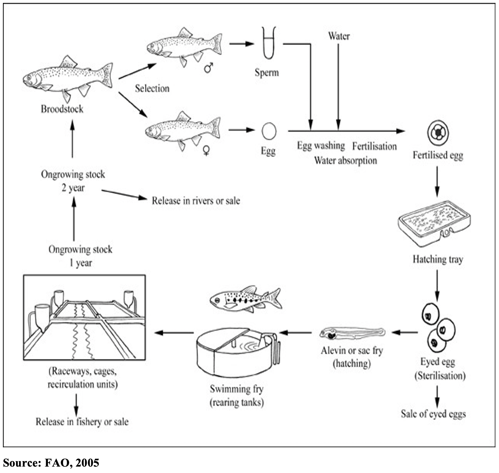 In case of aquaculture systems trout will not spawn naturally, hence eggs are taken artificially from the high quality brood fish when they are fully ripe. Males of more than two years old and females three years older are usually selected as the yield and quality of such fishes is good. The number of brood stock required is dependent on the number of fry or fingerlings required to meet the production schedule of the farm and it also depends on the survival rate of the different life stages and fecundity of the brood stock females. Generally the sex ratio of 1:3 is preferred that is one male to three females is deemed desirable. As brood stock maintenance is costly and labor intensive, so most of the farms purchase eyed eggs from other sources; these should be 'certified disease free'. Fishes which have attained age of more than two years can be selected for brood stock.
