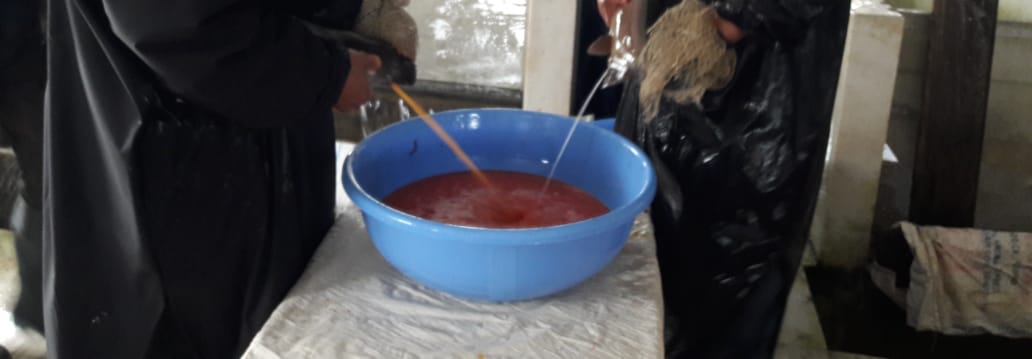 In one man method single person takes the eggs from the fish by holding the fish with ventral side down above the pan by one hand and by other hand a gentle pressure is applied and the eggs come out. In case of two man method one person holds the fish and other person perform the stripping operation.Hand stripping after incision: