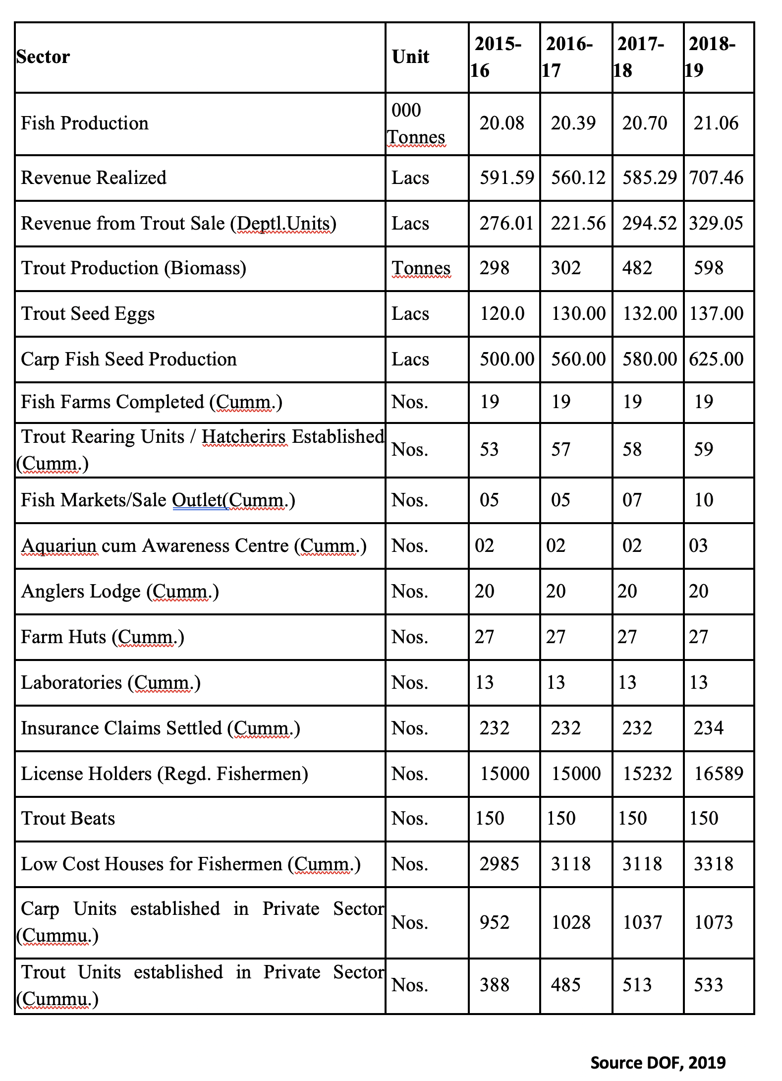 In Jammu and Kashmir, trout fisheries received a major thrust during the last two decades with the establishment of Mother Trout Fish Farming Project at Kokernag under European Union Assistance in 1984. The Department has another Trout Hatchery at Laribal where quality Trout seed of Brown Trout and Rainbow Trout is being produced. The use of modern technology in breeding and rearing of fish has ensured a better survival at different stages of the fish. Besides this, the Department established trout feed mill with highly equipped facilities imported from Holland in 2012 and it produces quality trout feed to achieve better conversion ratio and healthy stock. Both of these projects have the capacity to produce more than 132 lakh eggs per year. The state Department has established a network of more than 42 trout rearing centre in public sector and 513 rearing units in private sector across the State and the number is increasing day by day. (DoF J&K, 2019)