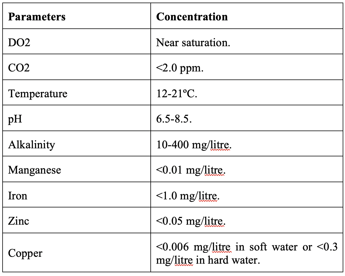 For the successful culture of trout, water should be pure, free from pollutants, transparent, free from dirt and suspended particles. For commercial trout production, the site must have a year-round supply of high quality water (1 l/min/kg of trout without aeration or 5 l/sec/tonne of trout with aeration), that meets a number of criteria: